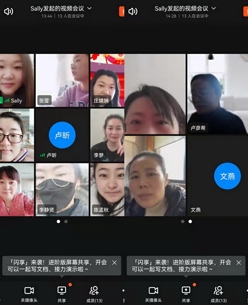 線上貢獻篇。“縱然居家隔離,一樣不防礙我們做貢獻,我們線上服務已經開啟”三八節(jié)這一天,在社區(qū)忙碌一天的公司女工委副主任宋文靜又特意安排了“三八”節(jié)線上活動。這一天活動精彩紛呈:首先是視頻連線,通過廣大女工并向她們家人傳達市委市政府以及集團黨委、投資公司黨委關于疫情防控文件精神。其次共同學習全國“兩會”會議精神。第三,開展公司“三新”解放思想大討論線上論壇,圍繞疫情防控、生產經營,尤其是企業(yè)轉型發(fā)展出謀劃策。最后還來了點小游戲-成語“飛花令”,給嚴肅的疫情防控增添了一息歡樂的氛圍。