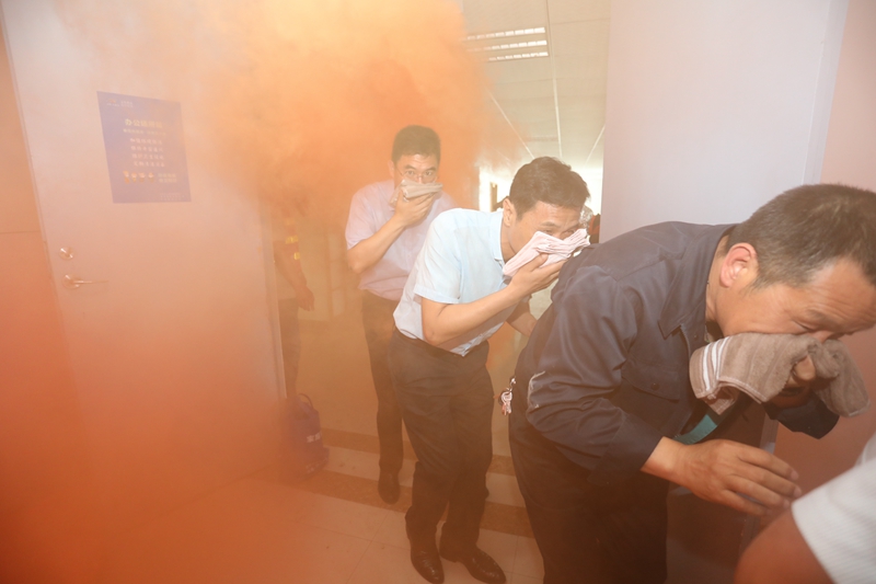 在消防演練現(xiàn)場我們模擬了突發(fā)火災(zāi),受濃煙影響的參培人員進行快速有序的疏散逃生。按照董教員的講解要求,大家“三折八疊”毛巾,浸濕后捂住口鼻,俯下身子,肘部依靠著墻壁,一個跟著一個,在濃煙中疏散撤離。接著演練還進行了油盆滅火和高壓水槍使用培訓(xùn)實操。參演人員嚴肅認真,服從指揮,整個應(yīng)急疏散演練過程忙而不亂、井然有序。