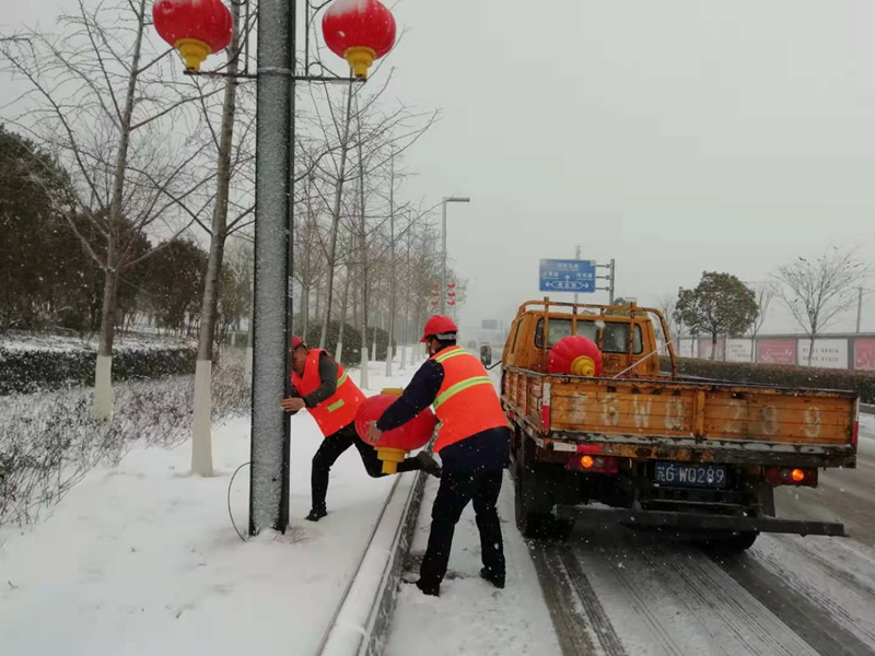 一夜的狂風暴雪將花果山大道路上的亮化燈籠刮掉不少,該項工程是翔立分公司今年承接開發(fā)區(qū)市政第一個亮化工程,安裝維護質(zhì)量的好壞決定著這該項目工程的能否持續(xù)承接。帶著一份堅守、心懷責任、更帶著翔立轉(zhuǎn)型發(fā)展的希望,“鐵軍”們一大早就已經(jīng)整裝待發(fā),奔赴施工現(xiàn)場收集整理燈籠。