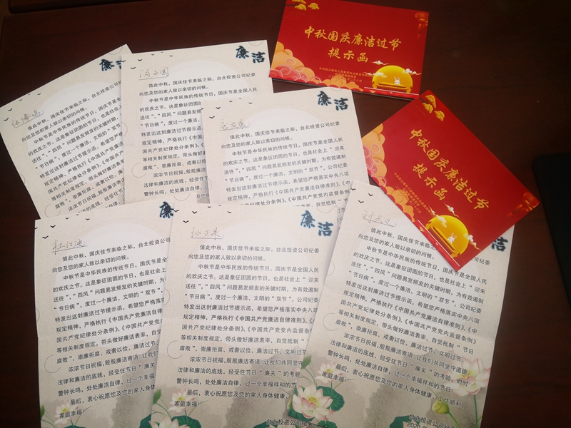 溫馨提示函早提醒。“值此中秋、國慶佳節(jié)來臨之際,臺北投資公司紀委向您和您的家人致以親切的問候……時時警鐘長鳴,處處廉潔自律,過一個幸福祥和的節(jié)日!”節(jié)前,公司通過廉潔提示函向黨員領(lǐng)導(dǎo)干部贈送節(jié)日廉潔提醒,將廉潔過節(jié)的紀律要求融入節(jié)日祝福。