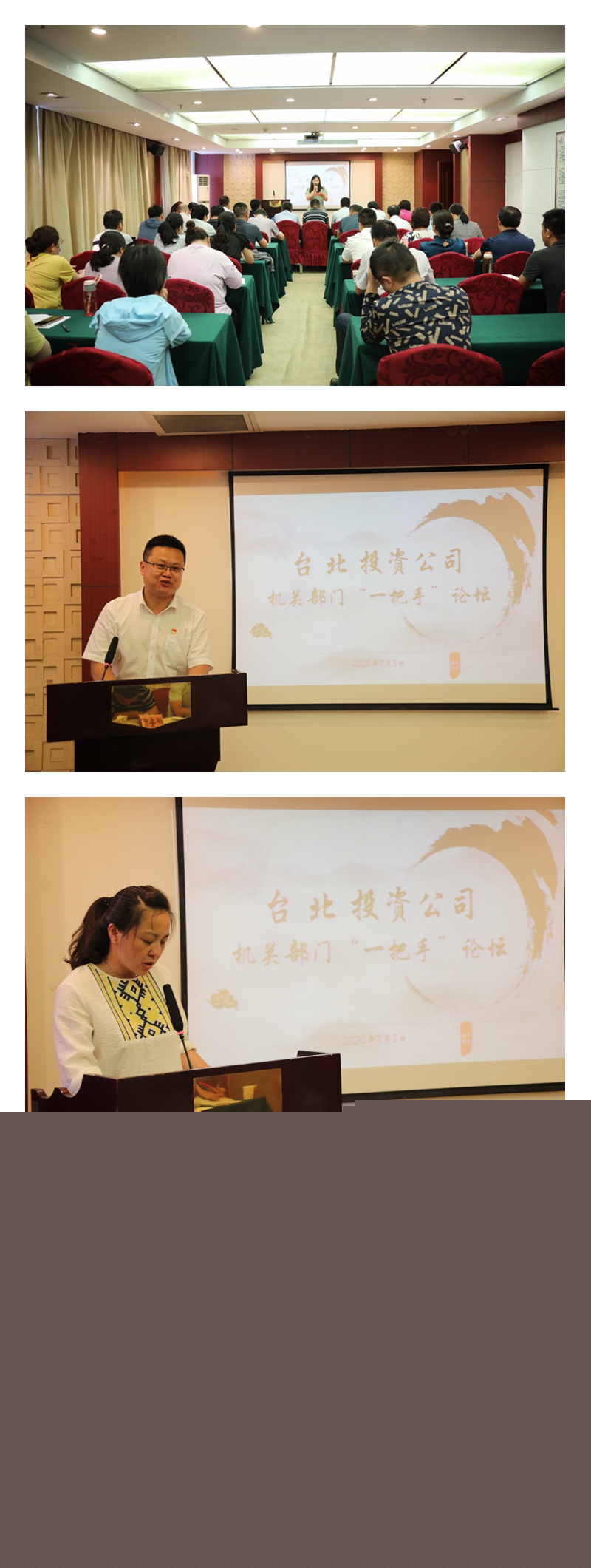 7月3日下午,投資公司在九樓會(huì)議室舉辦臺(tái)北大講壇——部門“一把手”專場,來自機(jī)關(guān)部門的八位同志走上講臺(tái),談心得,談想法,談思路,談措施。公司領(lǐng)導(dǎo)、各單位黨政負(fù)責(zé)人、機(jī)關(guān)部門部分人員參加了講壇。本次講壇由各基層單位主要負(fù)責(zé)人作為評(píng)委。