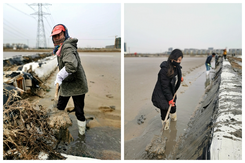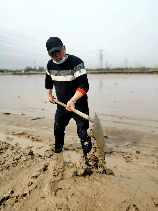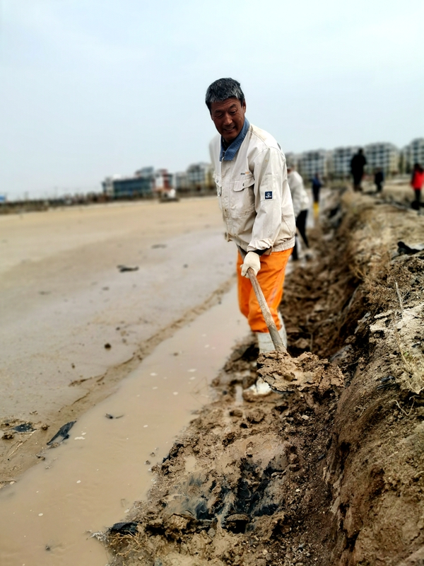 往東邊看,先鋒東灘黨旗招展分外鮮紅,海州灣公司18個(gè)單元職工、3名班組長(zhǎng)全員出動(dòng)馳援大浦工區(qū)協(xié)同重整410畝閑置鈣鹽灘地。引水入溝、翻泥上堰、腳踩和整、鐵掀蹋平,動(dòng)作嫻熟。1200余米的10余條池堰僅用一天的就順利完工。