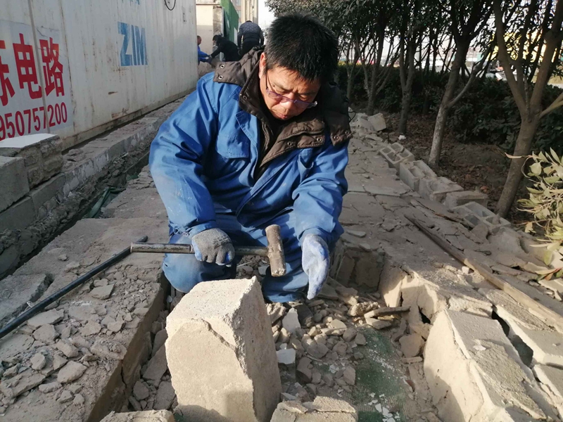據(jù)悉,該處墻頭整體倒塌,大多數(shù)磚塊沒有受到損壞。志愿者們一塊一塊的挑選、清理、搬運,將可以回收利用的磚塊整理好,用于墻頭的修葺。水泥、沙的配比不太熟悉,天氣寒冷如何做好防凍,怎么辦?臨達(dá)公司的退休老黨員主動站了出來,為圍墻修葺工作做指導(dǎo),提供幫助。經(jīng)過兩天的奮戰(zhàn),將倒塌的墻頭修葺好,并拉好了美化綠布。