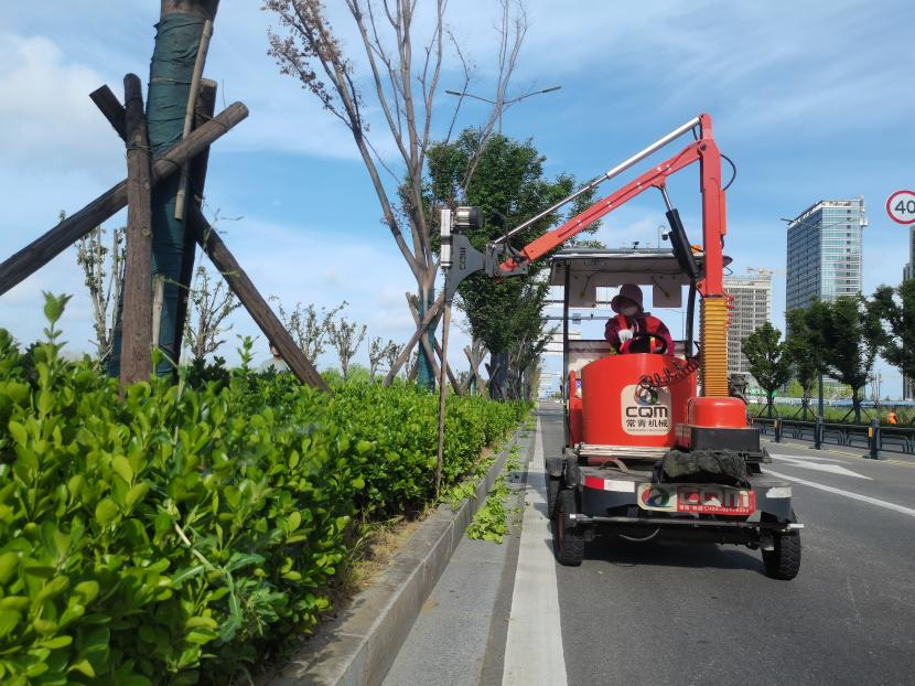 草坪修剪、模紋修剪……在體育公園、佛堂路,242省道班、先鋒路班綠化工人們頭戴草帽忙碌著。
