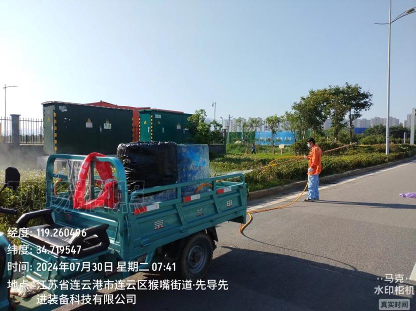 在242先導(dǎo)段,早上7時(shí),太陽(yáng)已經(jīng)開(kāi)始“發(fā)威”,室外溫度34℃。道路沿線(xiàn)的樹(shù)木花草在烈日暴曬下“無(wú)精打采”,薛興華正在用自己改裝的“澆水神器”,為苗木大量補(bǔ)水,確保綠化苗木安全度夏,遠(yuǎn)遠(yuǎn)看去,汗水已浸透了后背。