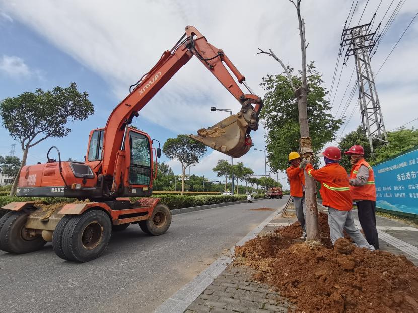 在東方大道加油站路段,孫銀、姚習(xí)轉(zhuǎn)戴著安全帽穿梭在工程現(xiàn)場(chǎng),不停地指揮著苗木的挖掘、起吊、卸載、種植、搭設(shè)支撐等。