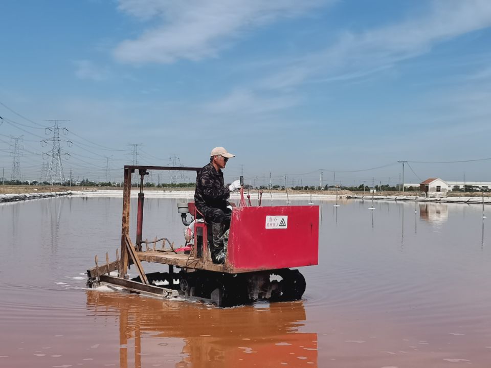 此時(shí)的鹽層大約已有五六厘米厚,若想長出晶瑩剔透的大顆粒晶體鹽,活碴作業(yè)是必不可少的。每日清晨6點(diǎn),昌圩班組、先鋒班組、大浦班組準(zhǔn)時(shí)有一名工人駕駛活碴機(jī),對鹽池板進(jìn)行破碎翻動(dòng),保持鹽層的疏松和顆粒間一定的間隙,確保晶體長得既快又好。通過活碴,鹽顆粒散亂在池底,經(jīng)過陽光照射會(huì)產(chǎn)生不規(guī)則的反射,大大減少了光線反射回水面的概率,易于提高鹵水溫度,增大鹵水蒸發(fā)量,從而增加原鹽的產(chǎn)量。
