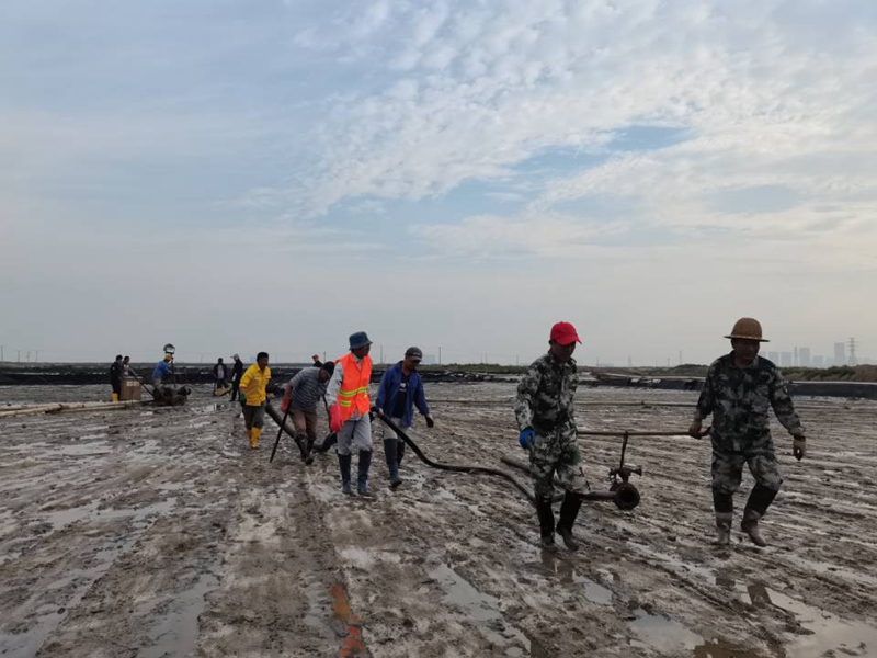 秋鹽開扒以來,海州灣公司上下所有干群,主動放棄節(jié)假日,晝夜奮戰(zhàn)在鹽池里。人工扒鹽三班倒,做到人停機(jī)不停;跟班人員24小時無縫銜接,確保時刻在扒鹽現(xiàn)場做好安全監(jiān)管工作。目前,隨著堿廠關(guān)停的步伐加快,原鹽搶收工作進(jìn)入到了決戰(zhàn)階段,在公司黨委的大力支持下,兄弟單位及機(jī)關(guān)各職能部門的火速馳援下,海州灣公司迅速啟動第二臺機(jī)械扒鹽管道,與人工扒鹽同步進(jìn)行。公司領(lǐng)導(dǎo)與廣大職工想在一起、干在一起,上下齊心、爭分奪秒,擼起袖子、甩開膀子,在鹽池間盡情地?fù)]灑著汗水,確保勞動成果顆粒歸倉,誓奪原鹽收官戰(zhàn)的勝利。