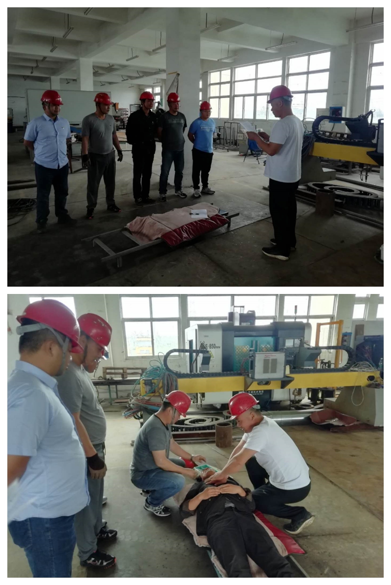 本次演練方案模擬在精工車間正常生產(chǎn)過(guò)程中,因?qū)﹄姎庠O(shè)備沒(méi)有經(jīng)常性檢查,液壓切板機(jī)切板時(shí)掉落的鋼板未采取防范措施將電氣電纜砸斷搭鐵,造成液壓切板機(jī)金屬外殼帶電,作業(yè)人員在正常操作機(jī)床時(shí)造成觸電事故傷害。當(dāng)同事發(fā)現(xiàn)有人觸電后,立刻做出救援反應(yīng),切斷電源將觸電人員安全隔離開后抬到擔(dān)架上進(jìn)行搶救。并同時(shí)上報(bào)應(yīng)救援指揮組,指揮組迅速做出響應(yīng),啟動(dòng)防觸電應(yīng)急預(yù)案,大家按應(yīng)急預(yù)案的分工迅速開展救援工作,撥打120急救電話、拉警戒線、查看傷情、緊急搶救、人工心肺復(fù)蘇等,直至觸電者蘇醒,在大家的共同協(xié)作下演練圓滿成功,翔立分公司湯占國(guó)總經(jīng)理對(duì)此次演練效果進(jìn)行了總結(jié)和點(diǎn)評(píng)。