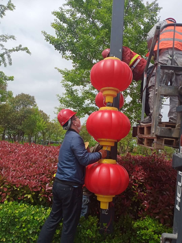 施工現(xiàn)場,大家配合默契利用小型叉車進(jìn)行輔助拆除作業(yè),五分鐘不用一個(gè)燈籠就拆除完成。這邊完成拆除部分,那邊負(fù)責(zé)還原以及運(yùn)送回收。由于燈籠的不可收攏性,同時(shí)為避免造成二次污染,對于拆下來的燈籠及時(shí)進(jìn)行運(yùn)送和回收保存,確保第二年要安裝的時(shí)候重復(fù)利用。