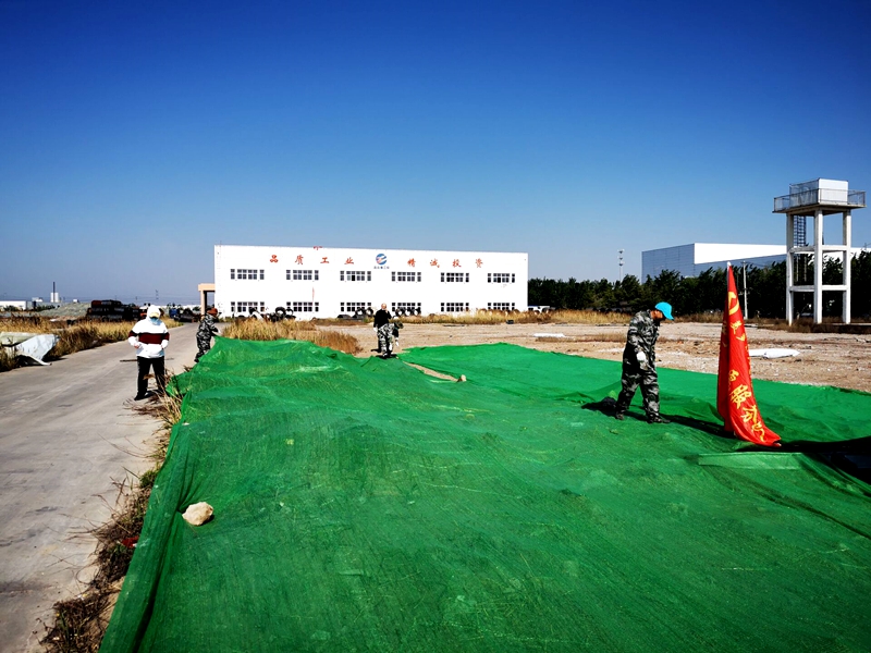 全體工作人員頂著烈日對黃土裸露區(qū)域進(jìn)行覆蓋。大家分工明確,有條不紊,一邊清理廢棄垃圾,一邊小心謹(jǐn)慎的扯著防塵網(wǎng)布與迎面吹來的大風(fēng)沙土博弈。大家不怕臟、不怕累,個個奮勇爭先。經(jīng)過半天的辛苦勞動,就完成了近萬平方的露天黃土覆蓋工作。放眼望去,一片“綠草茵茵”,看似不可能完成的任務(wù)在大家的同心協(xié)力下順利完工,自豪和喜悅油然而生。
