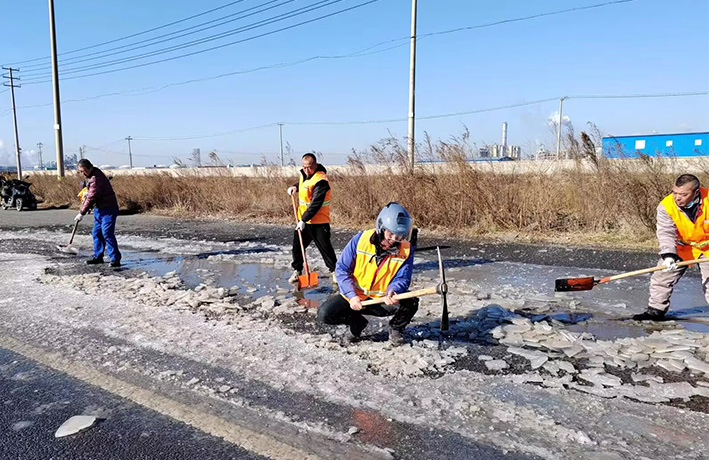 近期由于受冷空氣影響,氣溫低下,園區(qū)道路低洼積水處產生大面積結冰現(xiàn)象,如不及時清除,嚴重造成車輛側翻事故發(fā)生。道路排查現(xiàn)場,管理人員及時與園區(qū)二班對接,聯(lián)合開展“破冰保暢通”突擊活動。大家各負其責,齊心協(xié)力,揮動手中鐵銑、羊鎬,經過近4個多小時共同奮戰(zhàn),撬動冰塊近400多塊,清理積水300多平方、20多處。