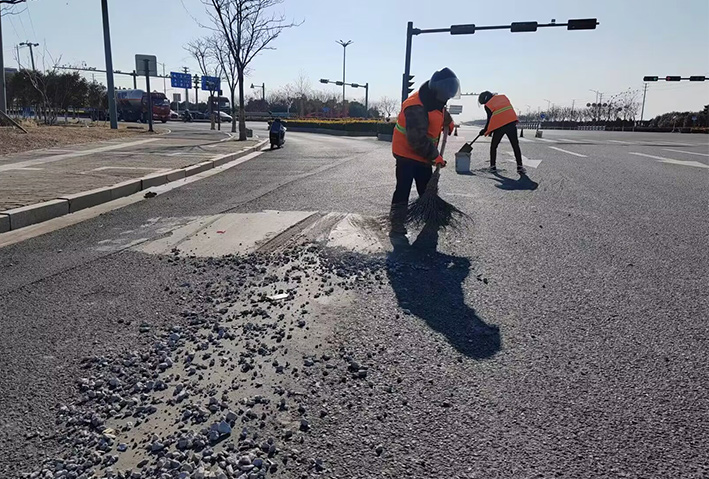 燈塔路路口,巡查人員發(fā)現(xiàn)大面積車輛拋灑物,生產骨干張學軍、徐習東、陸永柱接到公司應急處理電話第一時間趕赴現(xiàn)場,盡管天氣寒冷,但是大家干的熱火朝天,共清理泥塊30多處,長達800多米長;轉運石子、石塊50多車,他們再次用行動彰顯黨員示范風采。