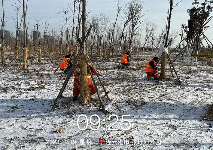 為確保園林樹木安全越冬,有效鞏固園林綠化成果,自11月中旬起,綠化分公司按照“早動員、早部署、早實施”的原則,在管養(yǎng)區(qū)域開展了冬季綠地管護(hù)提質(zhì)專項活動,通過澆灌凍水、樹木修剪、根頸培土、包裹樹干等多項舉措有力保證了苗木安全過冬。
