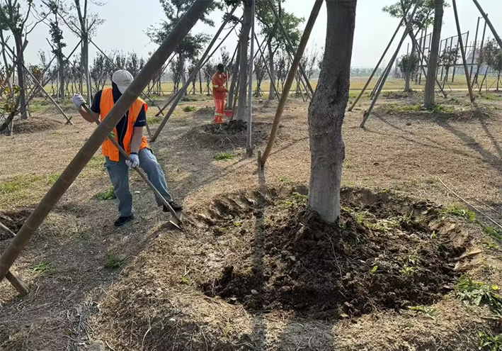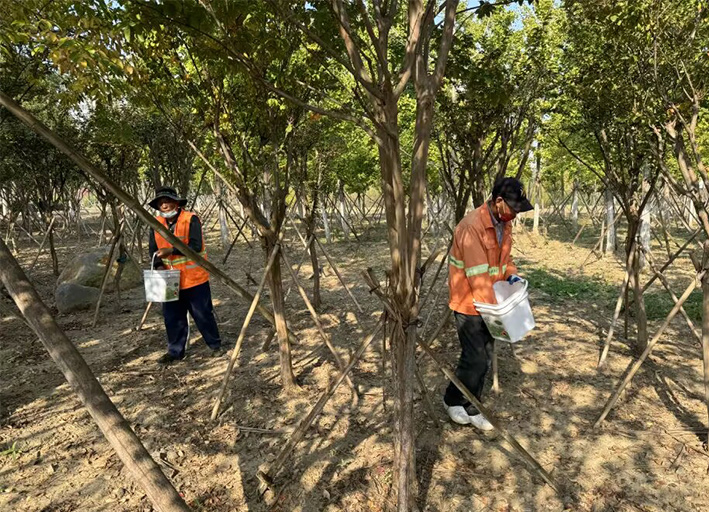 自十月中下旬以來,班組全體成員積極準備,做好抗旱保障工作。每天早晨7點,兵分二路,按照各自分工迅速行動起來。葛承東帶領(lǐng)一部分工人對櫻花林、紅梅林整理樹圍;田恒亮帶領(lǐng)一部分工人施肥澆水,有的同志拎小提桶施肥,有的拿自來水管在后面澆水。為保證水流進樹木根系,工作人員采取多種方法讓葉片、根系喝足水。為堅決打贏這場抗旱保樹木攻堅戰(zhàn),綠化分公司在堅持科學(xué)用水、節(jié)約用水的前提下,通過科學(xué)的修剪植物、抹芽,松土,除草等措施確保苗木安全度過干旱天氣。由于抗旱工作啟動較早,措施得當,抗旱保苗工作已取得初步成效。目前為止,已經(jīng)完成7000余棵櫻花林和紅梅林的施肥、澆水工作。